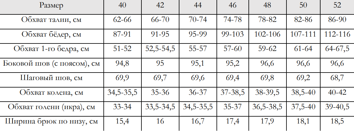 Таблица размеров