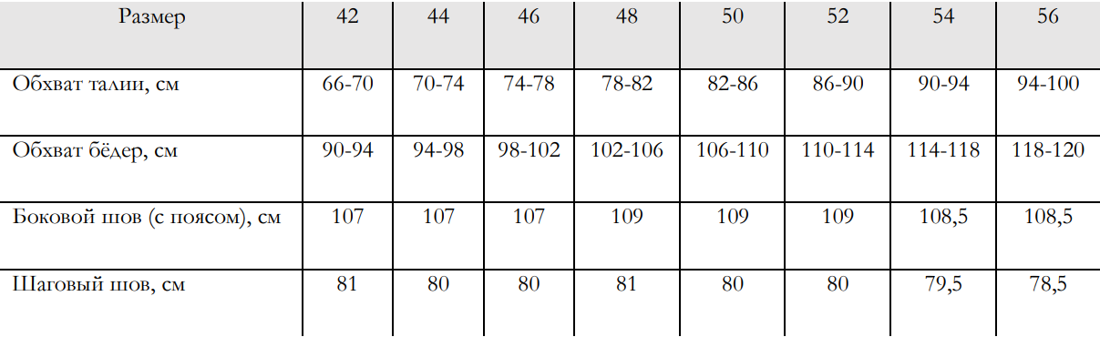 Таблица размеров